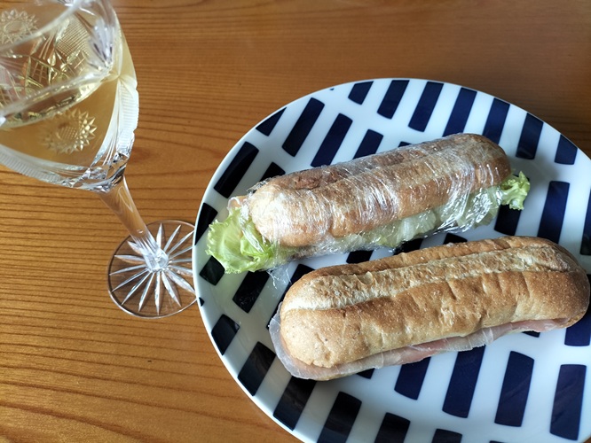 カスクートサンドで白ワイン 上野歩の今日もホフク前進 2025.09.14 カスクートサンドで休日のブランチです。奥のラップにくるんであるほうが、レタスとベームスタースプリングミルク。レタスがたっぷりなので、食べやすいように妻がラップでくるんだわけです。手前はゴルゴンゾーラピカンテと生ハムです。味変で蜂蜜をちょっとつけると、イチジクのよう。白ワインは、お昼に飲むのにいいです。朝ならスパークリングワインかな。