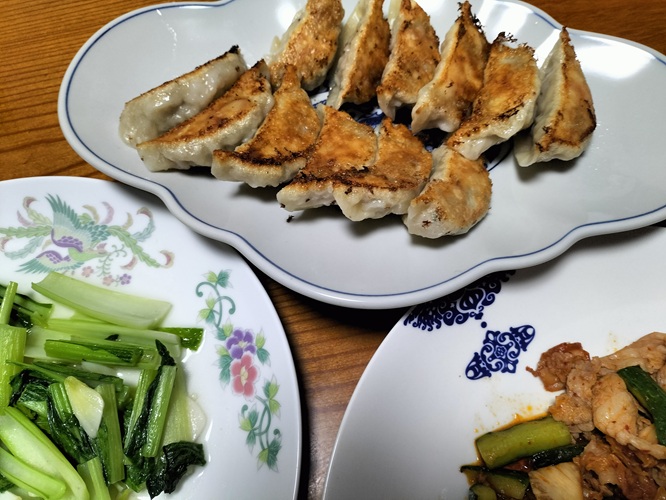 我が家中華⑯ 上野歩の今日もホフク前進 2025.11.09 今夜の中華の主役は餃子です。なんといっても自家製だからです。皮がもちもちでかりっとしてて、具はキャベツと挽肉がたっぷりでジューシー。小松菜のニンニク炒めと豚肉とキュウリのピリ辛炒めで、紹興酒です。