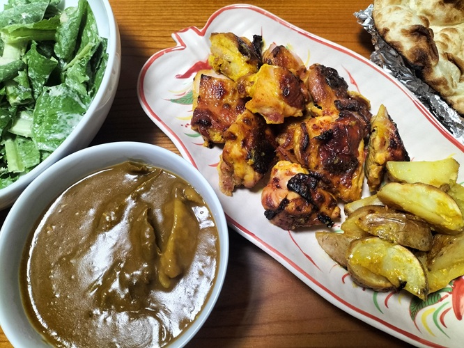 牛すじカレー 上野歩の今日もホフク前進 2025.11.11 このところ「牛すじを煮たのが食べたい」「カレーが食べたいな」と断片的に言っていた僕に対し、妻が牛すじカレーをつくってくれました。タンドリーチキンは、僕が最も好きな鶏料理だと断言できます。サラダはパンなしのシーザーサラダ風。そしてナン。
