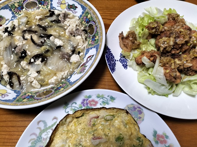 我が家中華⑱ 上野歩の今日もホフク前進 2025.11.29 白菜と豚肉、きくらげのうま煮と油淋鶏(ユーリンチー)です。下のお皿は、カニ玉なのです。縁が黒く焦げてるように映ってますが、さにあらず。片面だけを焼いているので、卵はふわっふわです。カニのむき身入りで、とてもジューシー。カニ玉って、甘酢あんをかけるのが普通なのですが、僕は甘酢あんが苦手なのです。だから、なしを妻にリクエストしました。中華屋さんでも、天津飯ってまず食べないな。