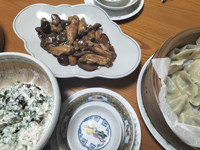 我が家中華⑳ 上野歩の今日もホフク前進 2025.12.312026.01.01 この日は友諠商店で買ってきた冷凍餃子をせいろで蒸し、ピータンを白和えにしました。白和えには、くるみとパクチーも入ってます。手羽と栗、しいたけの辛味炒めは五香粉がきいてます。さて、ここまで「我が家中華」と題し、カウントしてきましたが、⑳となったところで一応このタイトルは終了に。来年からはまた新たに我が家の中華を紹介してみたいと思います。